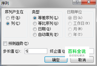 弹出对话框后,选择“列”,“等差序列”,在步长值中填入“5”,然后单击“确定”,如图: