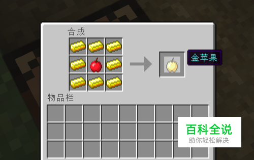 准备金苹果 金苹果是治疗僵尸村民的重要道具,你可以在地牢或遗迹里得到金苹果,也可以自己用苹果和金锭制作一个,配方如下图。