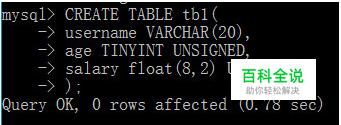 下面在db1数据库中创建数据表tb1 CREATE TABLE [IF NOT EXISTS] table_name(column_name data_type,...) 在下面的数据表tb1中,创建一个VARCHAR(20)的变长字符型的username字段;创建一个TINYINT UNSIGNED的一个字节长度的无符号(0-255)整型的age字段;创建一个salary FLOAT(8,2) UNSIGNED的数字总长度为8,小数位数为2的无符号浮点数的salary字段,如下图所示: