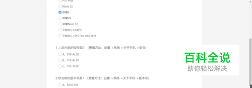 问卷也很简单,大致分2部分,填写手机的具体型号、手机号码以及设备参数。 我的是荣耀9,选择9,然后会让你输入具体型号和当前EMUI的版本号。