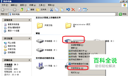 1、首先打开我的电脑-单击右击硬盘-在单击共享和安全。