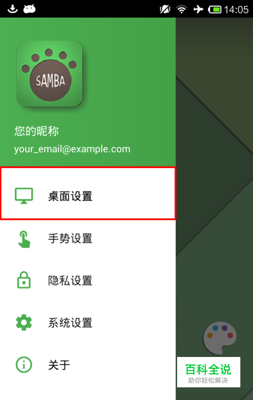 首先在小米手机上安装森巴桌面,然后打开森巴桌面,并从左侧往右拉出导航栏如下图所示,点选桌面设置。