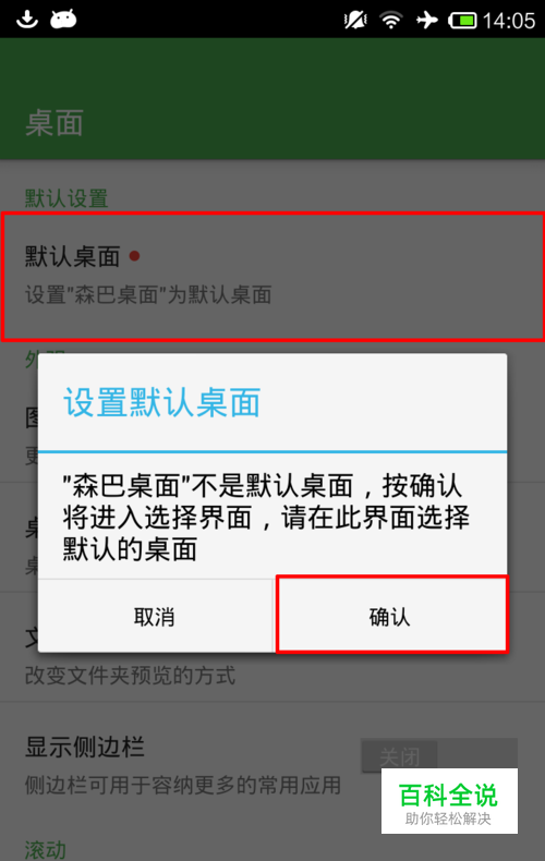 进入到桌面设置后,点选默认桌面选项,弹出设置默认桌面对话框后选择确认,如下图所示。