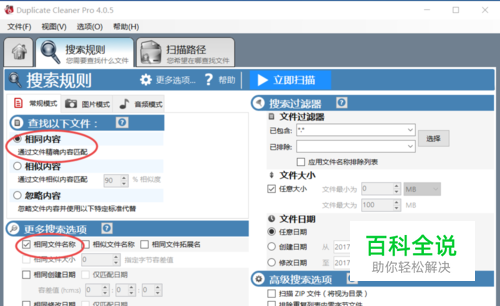 2、点击搜索规则,选择“相同内容”、“相同文件名”即可实现重复文件的精确匹配。