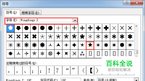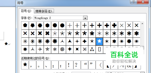此时会弹出一个“符号”对话框,我们将字体修改为“Wingdings 2”,然后将右侧的滚动按钮拉到最后,找到自己需要的五角星符号,单击“插入”按钮。