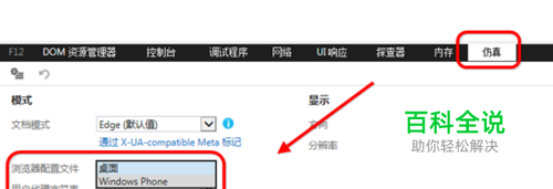 在打开的开发者工具里面,找到仿真(浏览器配置文件选择windows phone)