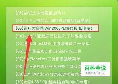 重启电脑,通过快捷键引导u盘启动打开大白菜主菜单,移动光标选择“【03】运行大白菜Win2003PE增强版(旧电脑)”回车确认