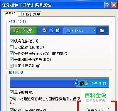 在属性界面中的上方会有“任务栏”和“开始菜单”两个选项,点击“任务栏”,在下方可以看到“自定义”选项并点击。