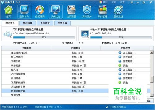 然后检查是不是中病毒了,可以使用金山卫士进行木马查杀,在查杀木马的同时可以修复病毒木马对ie组件进行的破坏。