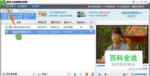 打开转换器,先添加视频文件,单击左上角的“添加视频”按键,然后在打开的文件夹中打开需要转换的flv视频导入即可。文件可以是多个,可批量转换的。这是最近我比较喜欢看的韩剧MV,转换成mp3就能放手机上听了,上次我也试过转成amr做手机铃声呢。