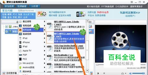 选择输出格式,即预置方案。单击预置方案右边的不倒三角,打开上拉菜单,如图所示,支持的播放设备和输出格式还是很多的哦。不废话了。这里选择常用音频一项中的MP3-MPEG Layer-3 Audio(*.mp3) ,格式下方也有中文说明的。