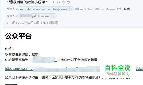 在点击注册之后,会有一个邮箱的验证,如下图的登录邮箱,在收件箱你会看到一个weixinteam的邮件,打开,就可以看到如下图的邮件,点击验证链接。