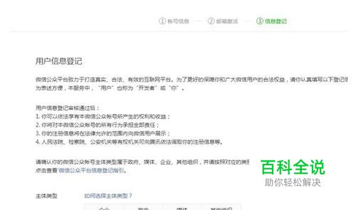 点击验证链接之后,会直接跳转到注册的第三步,信息的登记填写,如下图选择相应的小程序主体类型,可以看到只有四个选项,个人是无法注册小程序的,所以可以选择