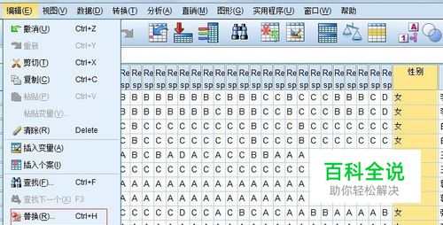 选中“性别”一栏,点击菜单栏中的“编辑”——“替换”。
