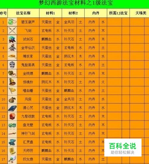 某些2级和3级法宝还会增加材料,需要1级法宝、三眼天珠、九眼天珠、人参果…… 之所以个别材料打上2种五行,是因为某些法宝材料的五行是相同的,可以根据材料变换五行位置摆放材料。 以下的材料摆放位置,是根据不同门派的玩家实践收集起来的,仅供参考。 需要特别提示的是,某些3级法宝是需要1级法宝触发的,1级法宝的位置可根据它自身属性设置五行位置,不要盲从。
