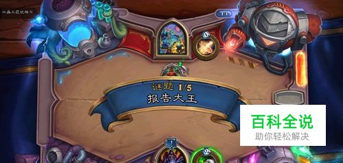谜题二 给个痛快 1.打出手中牌“沟渠潜伏者”,攻击敌方任一一个“炮台哨兵”; 2.依次打出手中牌“亮石技师”、“污手街供货商”、“圣光楷模”; 3.继续打出手中牌“燃鬃.自走炮”、“圣光楷模”。