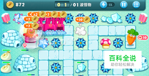 首先先按图中所示将部分雪花换成其他炮塔,并升到顶级,出口四个雪花中的第一个换成蘑菇,攻击下面的雪屋道具