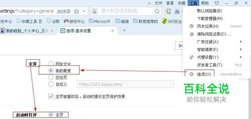 点击工具下拉选项按钮,你可以看见,页面内的主页:我的最爱选项。还有启动时打开我的最爱选项。