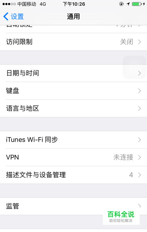 打开我们的“设置”里面的“通用”一栏,找到“描述文件与设备管理”这一栏有的显示的是“描述文件”或者是“设备管理”都是一样的,点击这一栏。