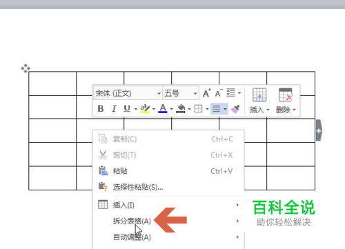 移动鼠标指针,指向右键菜单中的【拆分表格】。