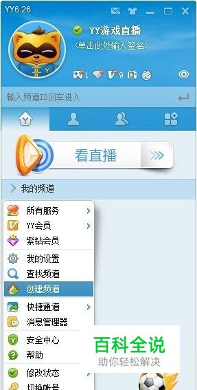 注册好YY号之后,登陆YY,点击YY左下角的YY熊选择“创建频道。
