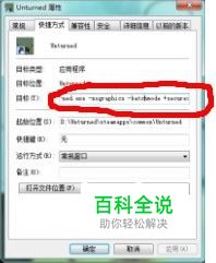 之后右键,点击属性,就在红圈这里,在Unturned.ese后面加上-nographics -batchmode +secureserver(注意:ese和-nographics的-有空格)然后+secureserver 空格 后面写你的服务器名字。