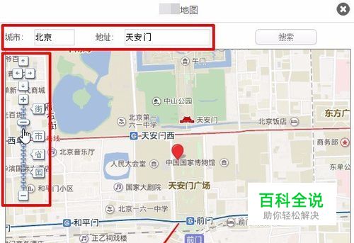 输入城市及具体的地理位置,点击“搜索”。调整地图界面左侧滑块,可放大或者缩小地图显示的区域,长按鼠标左键可拖拽显示的范围,点击“确定”插入到文章中。