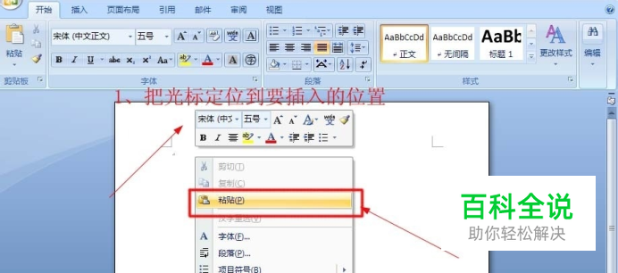 打开word文档,把光标定位到要插入图片的位置。点击鼠标右键,在下拉菜单中选择“粘贴”。