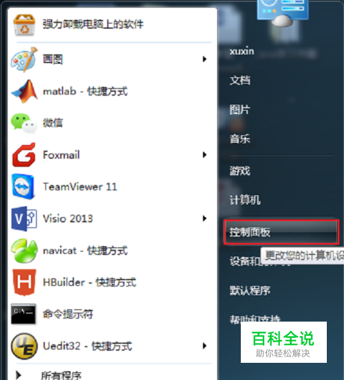 第一步在我们的电脑上点击windows图标,选择控制面板,如下图所示: