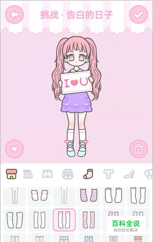 袜子 要去告白,同样选择一双中筒白色袜子,在袜子口周围有红心点缀,位置见下图。 挑选好衣服鞋子后穿上它,然后点击“√”提交,就可以成功挑战“告白的日子”了