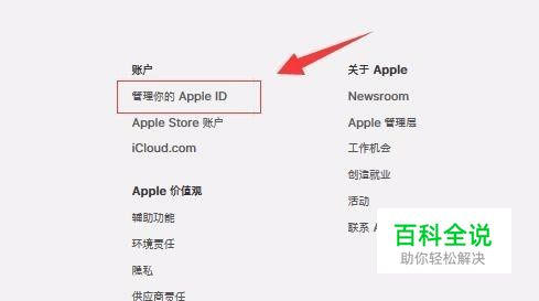 首先,打开苹果官方网站,在网站的底部找到“账户”下方的“管理你的 Apple ID”,点击进入。如图: