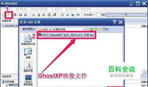 2,点击工具栏上的“打开”图标,选择要打开的IOS映像文件,本篇以GhostXP SP3系统映像文件为例,选择好了,然后按“打开”按钮。