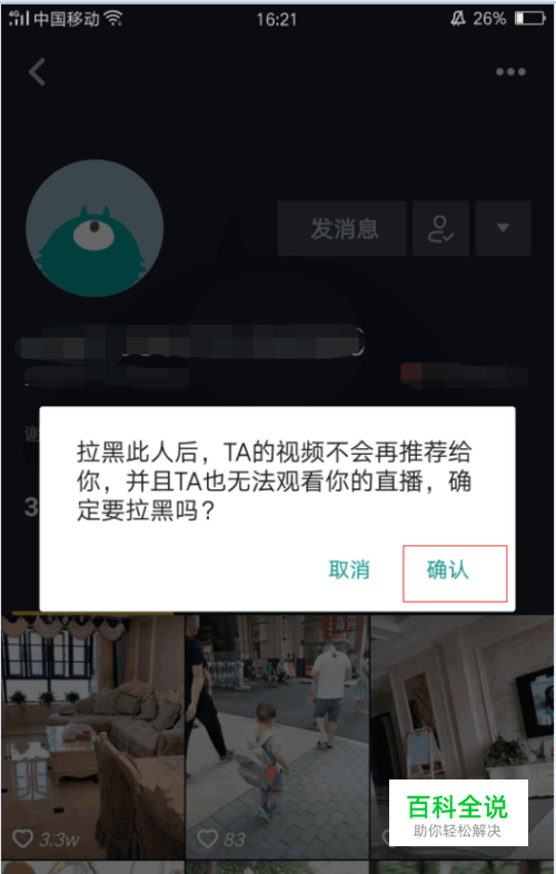 选择对话框中的拉黑,会弹出个提示框,提示你一但拉黑,他的视频不会推荐给你,他也无法看到你的视频,点击确认,你会看到你所关注的人中已经没有他了,你也不会看到他发布的视频了。