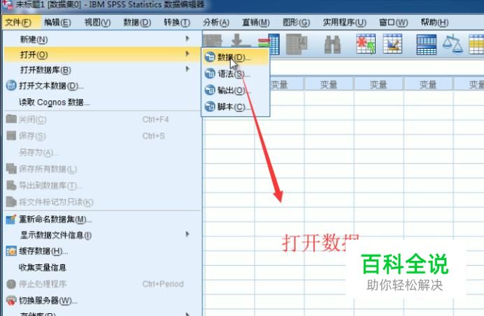 首先打开SPSS软件,点击右上角的文件菜单,然后选择数据选项,如下图所示