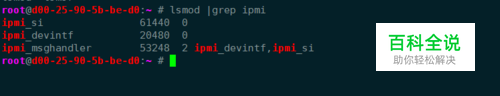 这里已经加载了ipmi的模块了。 如果什么也没有显示,说明没有加载模块儿。 需要执行命令加载模块。 # modprobe ipmi_msghandler # modprobe ipmi_devintf # modprobe ipmi_si