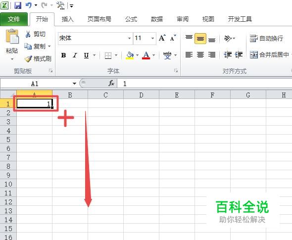 之后我们选中1这个单元格,然后放在该单元格右下角处,出现十字符号后,我们下拉;