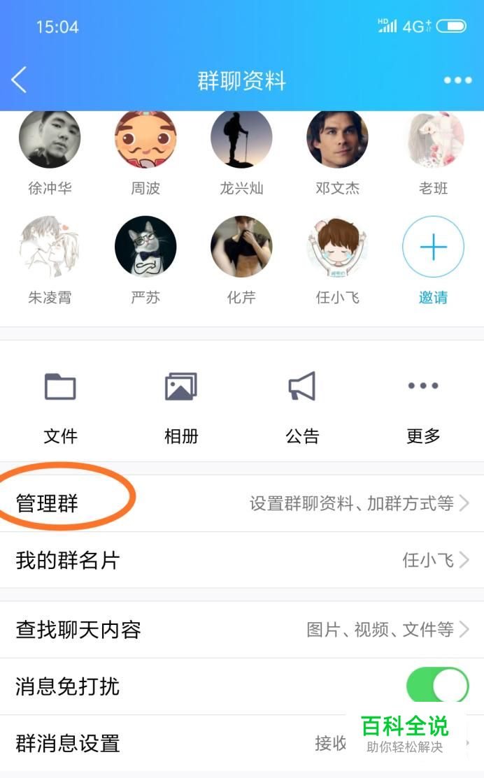 进去后,找到“管理群”选项,此选项只有当你是该群的管理员或者群主的时候才会出现。