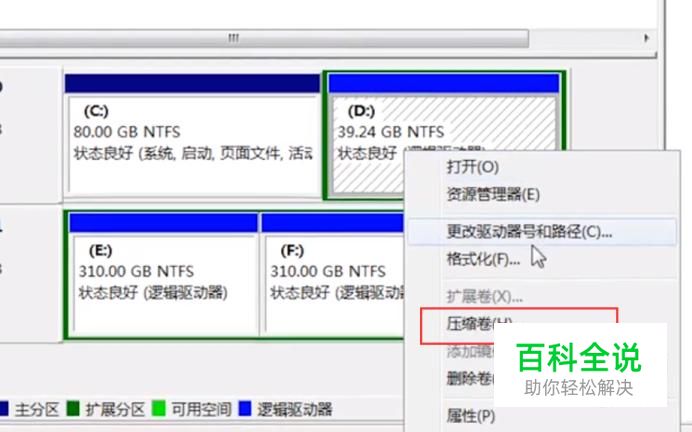 首先进入计算机管理界面,找到磁盘管理,右键单击D盘,选择压缩卷