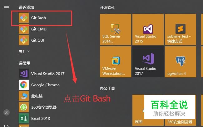 首先点击Windows的开始菜单,在弹出的界面中选择Git Bash选项,如下图所示