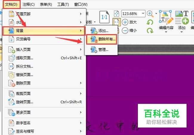 将PDF文件用工具打开后,我们点击文档按钮,然后在弹出目录中选择背景,再点击二级目录中的删除所有。