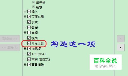 在自定义功能区的右侧,我们勾选主选项卡下面的“开发工具”,点击确定返回到表格,然后我们就能在表格上方的工具栏看到“开发工具”这一项了;