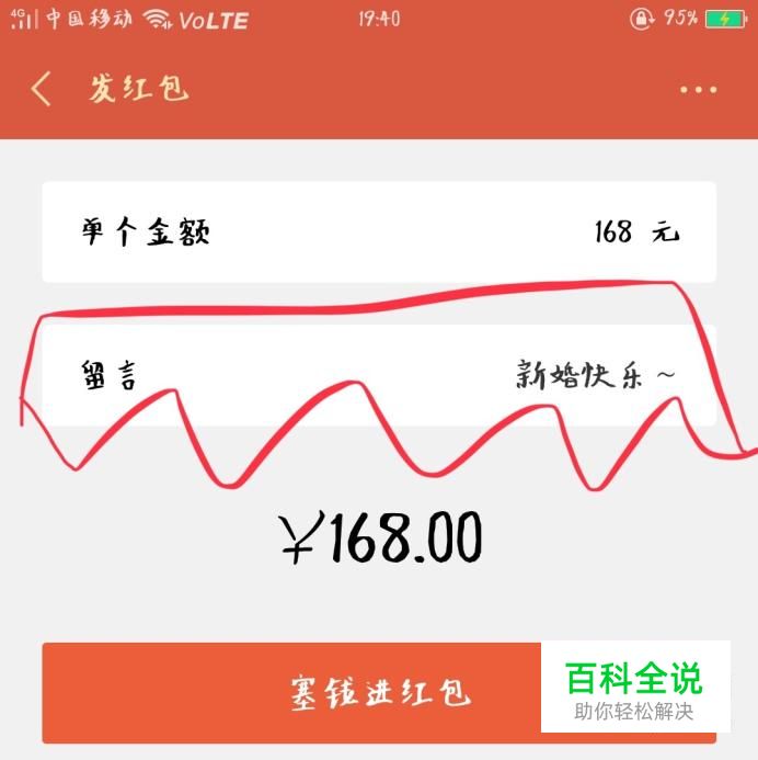 进入红包编辑界面,在留言一栏可以更改红包留言,编辑完成后点击塞钱进红包。