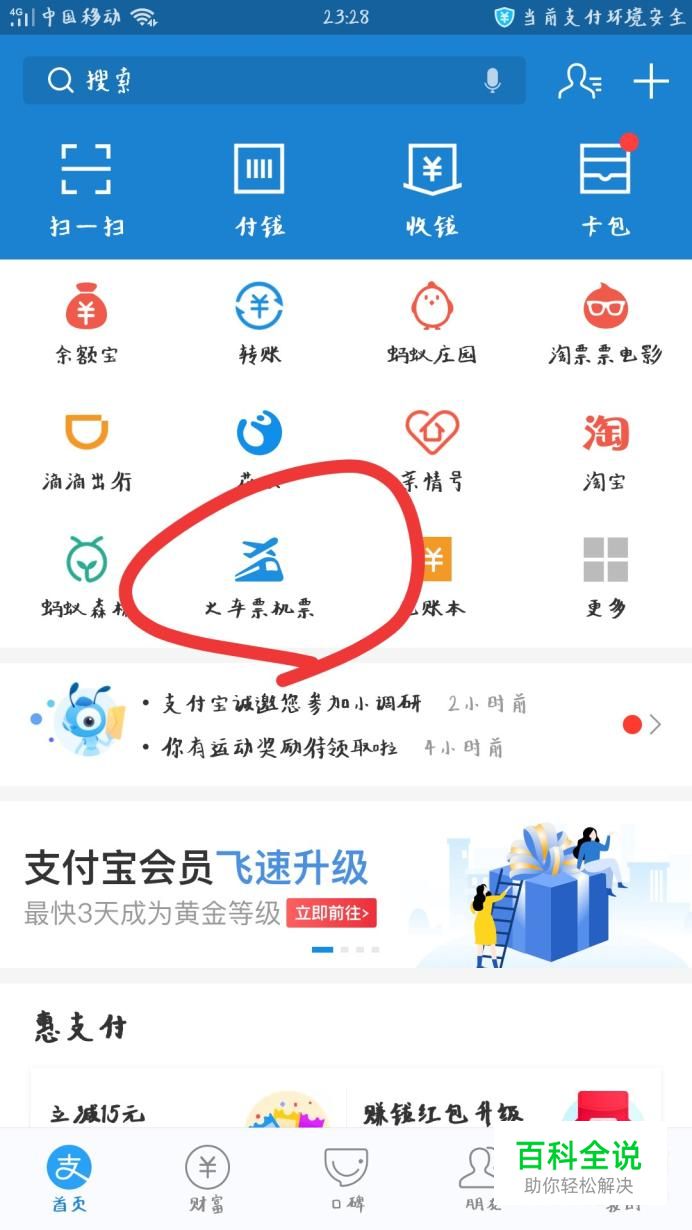 手机改签火车票可以使用“支付宝”软件来改签,首先下载支付宝软件后,点击打开支付宝,进入首页,点击下方“火车票/机票”选项。