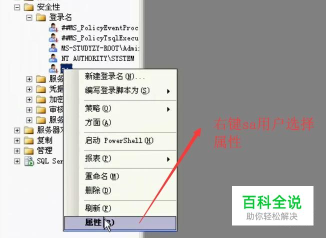 进入服务器以后我们右键单击sa用户,选择属性选项,如下图所示