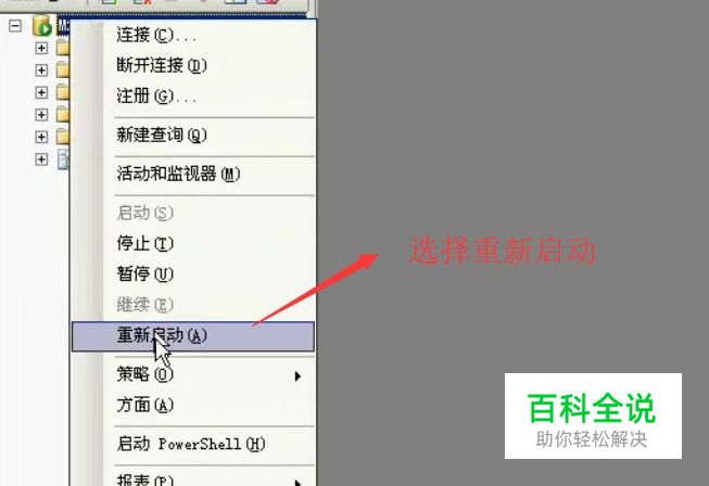 接下来我们在右键单击服务器名称,这次选项重新启动选项,如下图所示
