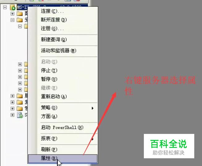 接着我们右键单击服务器名称,在下拉菜单中选择属性选项,如下图所示
