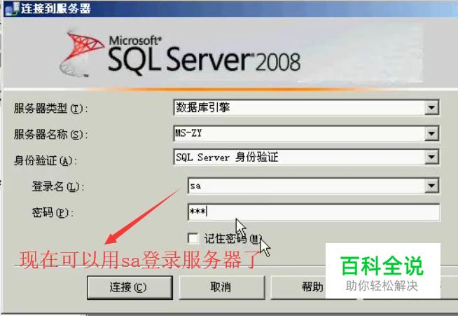最后重新进入服务器的登录界面,我们这次就可以用sa用户登录服务器了,如下图所示