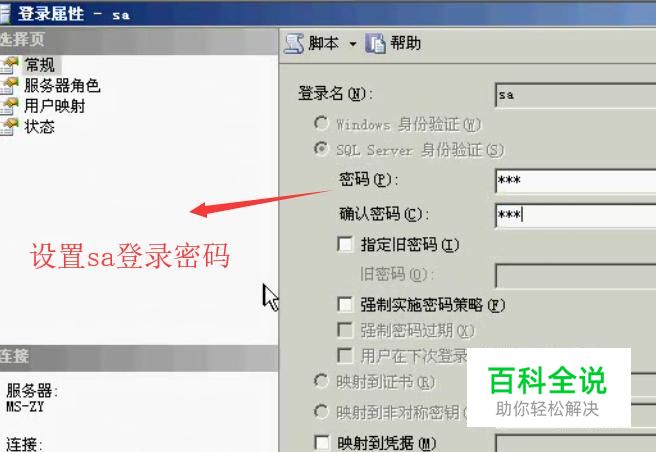 接下来在属性界面中我们选择常规选项,在右侧的密码输入框中设置sa的登录密码,如下图所示