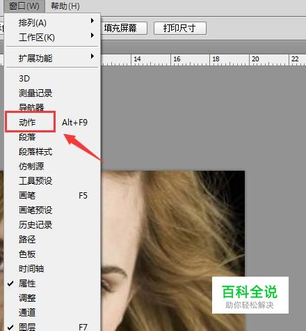 打开图片之后我们在菜单那里找到窗口选项,点击该选项在其内找到动作选项,如图所示: