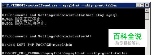 Windows环境的找回方法: 范甘迪说法国 1、打开cmd命令窗口,先输入命令: net stop mysql 回车 #关闭mysql服务。 进入到D:\SOFT_PHP_PACKAGE\mysql\bin\ 目录下,执行mysqld --skip-grant-tables 启动MySQL Server (如果报错,执行mysqld-nt --skip-grant-tables)如图: